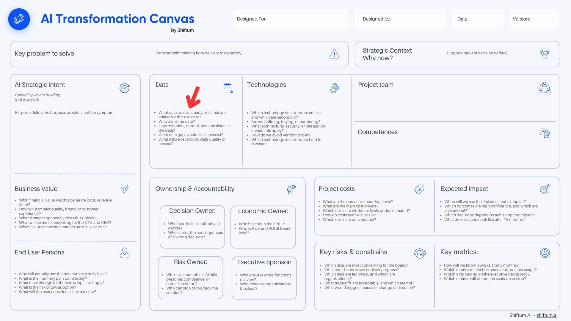To help you make the right decisions and properly prepare for this project, we're sharing our proprietary AI Transformation Canvas by Shiftum.
