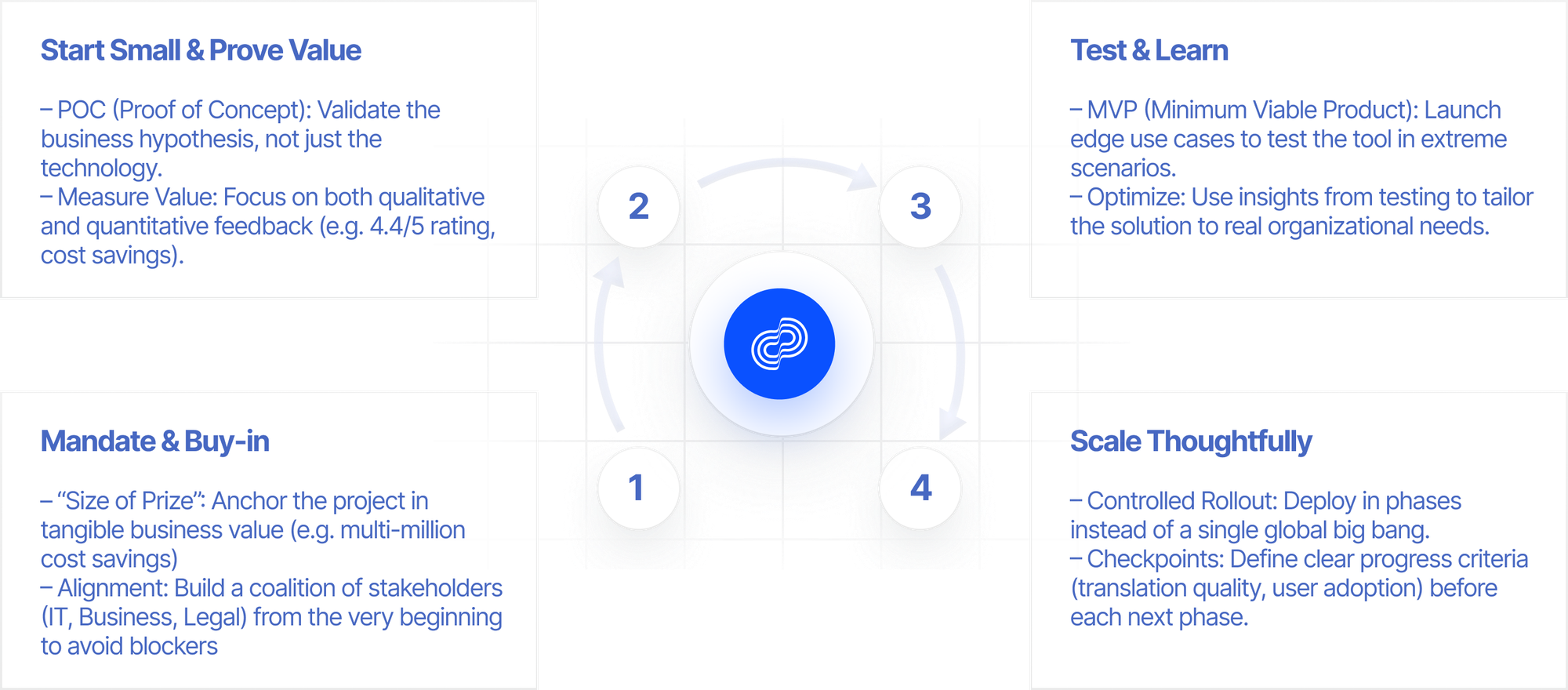 From PoC to MVP, from MVP to global rollout — each stage must have clearly defined progress criteria. For AI Translate, these included: