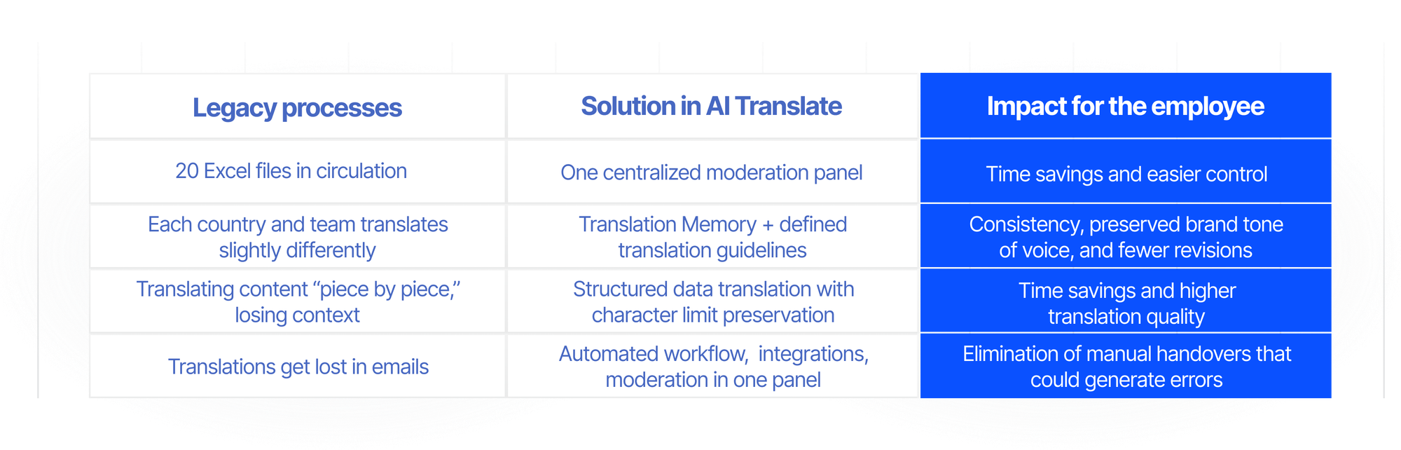 At the MVP stage, we did not limit ourselves to a single translation process. We launched multiple scenarios and workflows — for marketing teams, regulatory affairs, and customer care. This allowed us to: