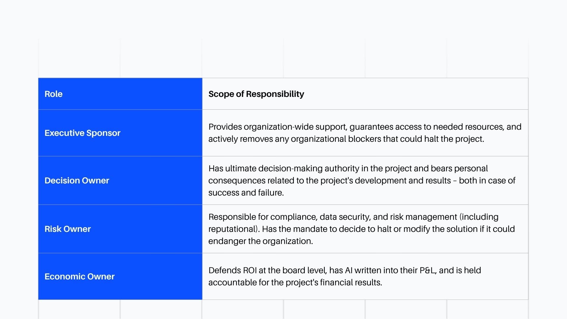 Economic Owner is the person who has the AI project written into their budget (P&L) and who must defend the return on investment at the board level. This role forces treating AI not as a technological experiment but as a business investment with specific financial expectations.